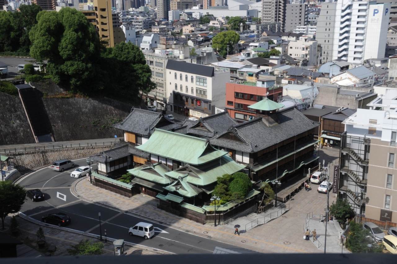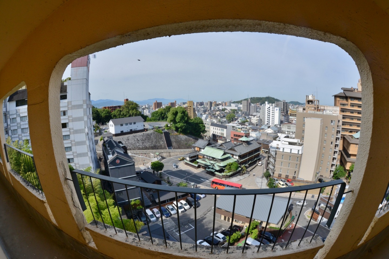 用意された部屋が最も西側から三つ目であり、道後温泉本館がほぼ真下に見えた。