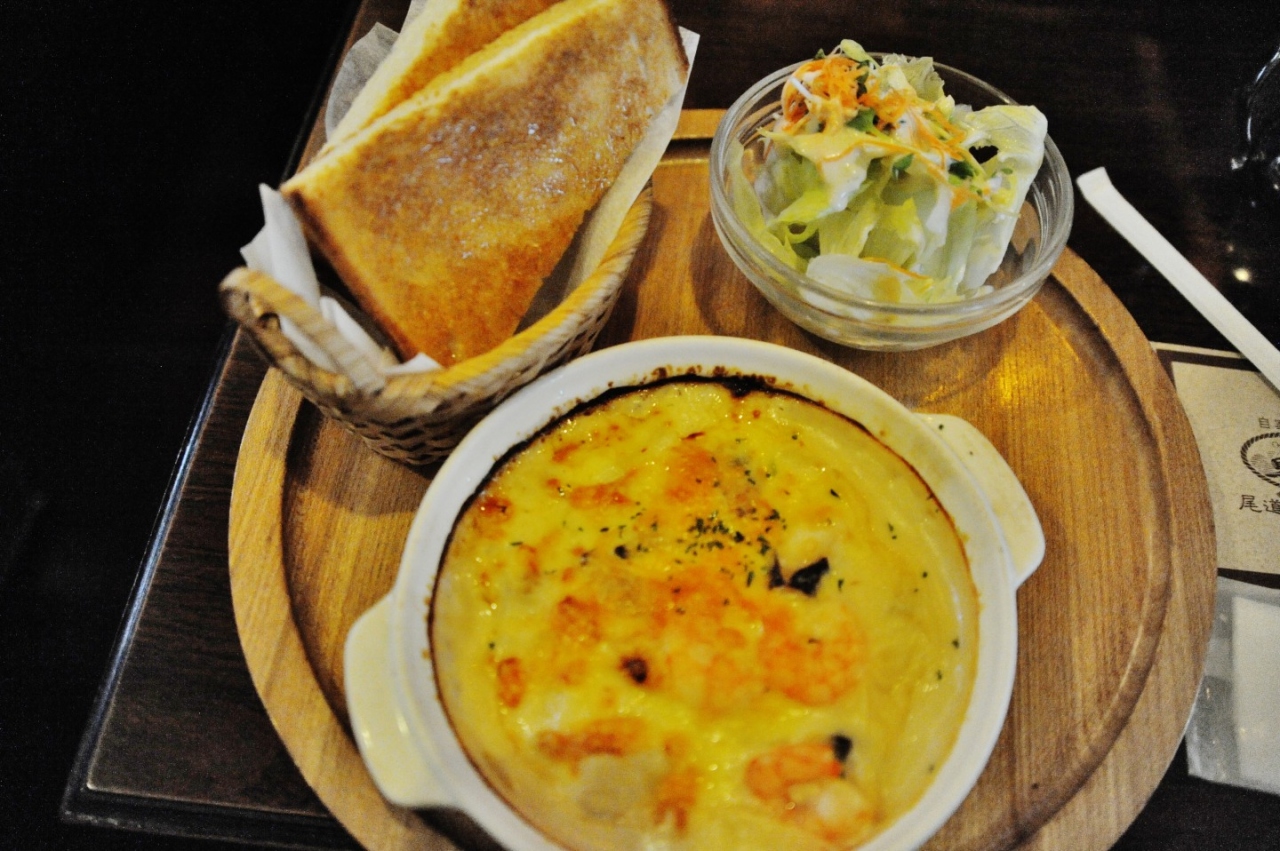 千光寺展望台から地上に降りたのが、ちょうど昼飯時。四国瀬戸内海へ来て三日目。うどんは食べ飽きた。旅館の豪華な朝食、夕食はもうたくさん。旅館ではお茶は出るが、コーヒーは出ない。そうだコーヒーを飲もうと入ったのかここ。場所は千光寺ロープウェイ地上駅と二号線をはさんで反対側の商店街の一角。頼んだのはグラタン、パンとサラダとアイスコーヒーのセット、同行者はパンケーキとコーヒーのセット。