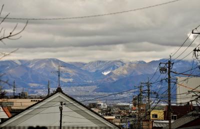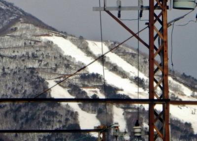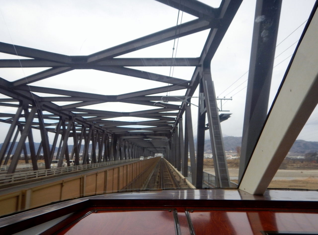 先頭車両からの風景は高く評価する。雪を被った信濃の山々、スキー場がよく見える。