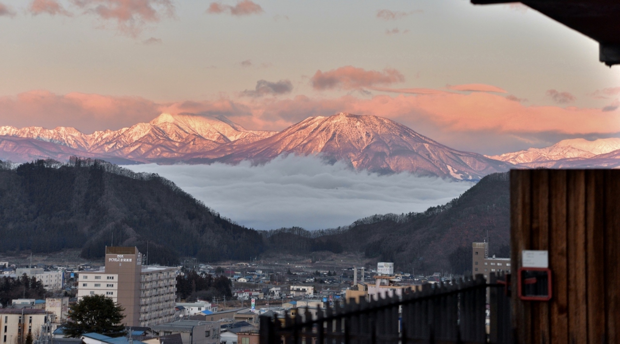 本館8F815号室から朝、ベランダから北西方向に朝日に輝く雲海と雪を被った山々が見えた。美しい。