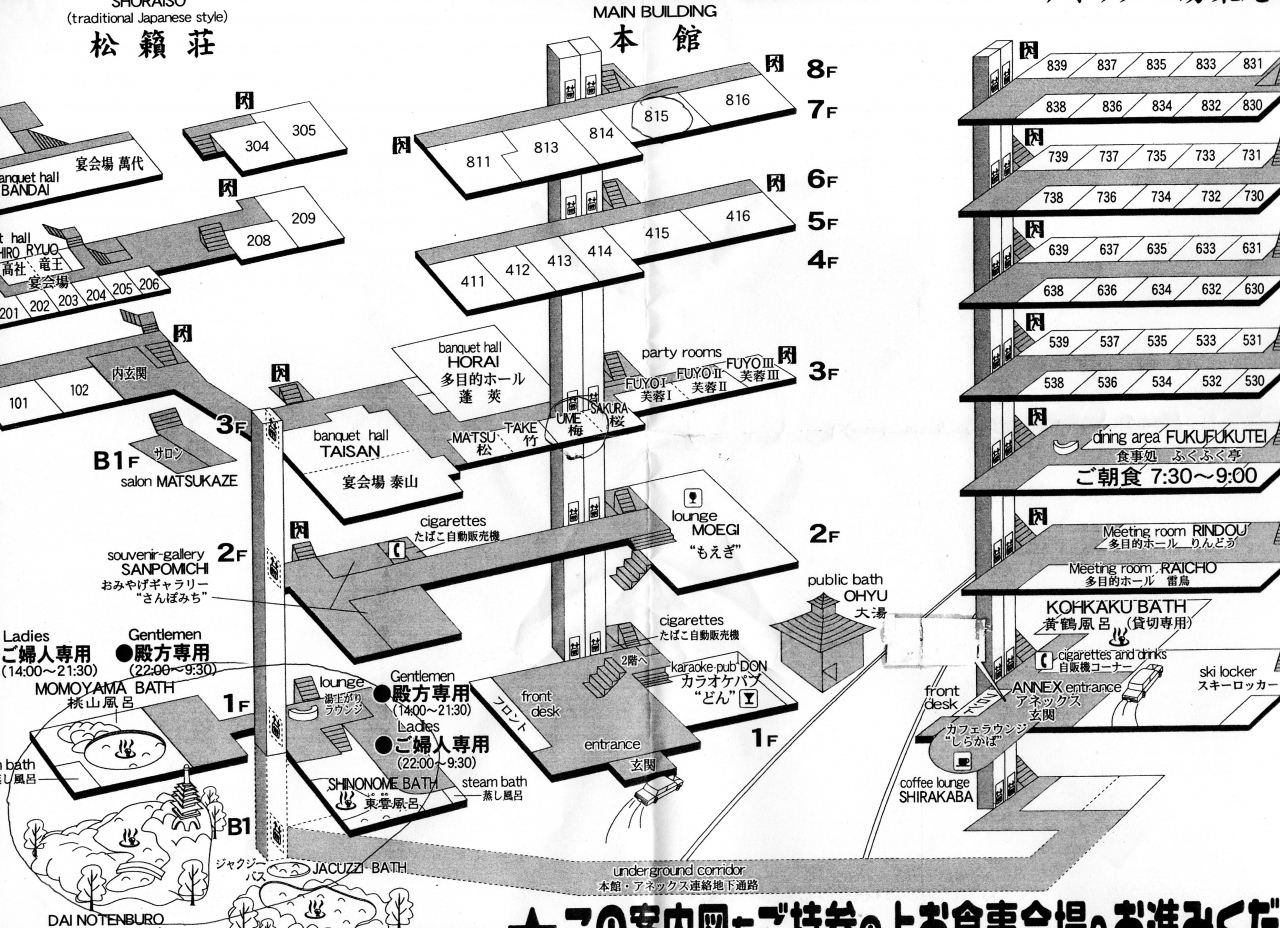 松籟荘と本館は2Fでつながっている。アネックスと本館は地下でつながっている。