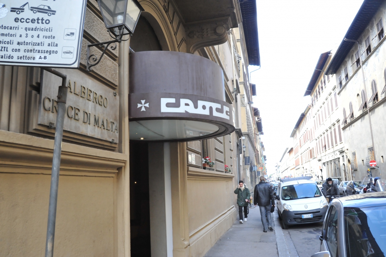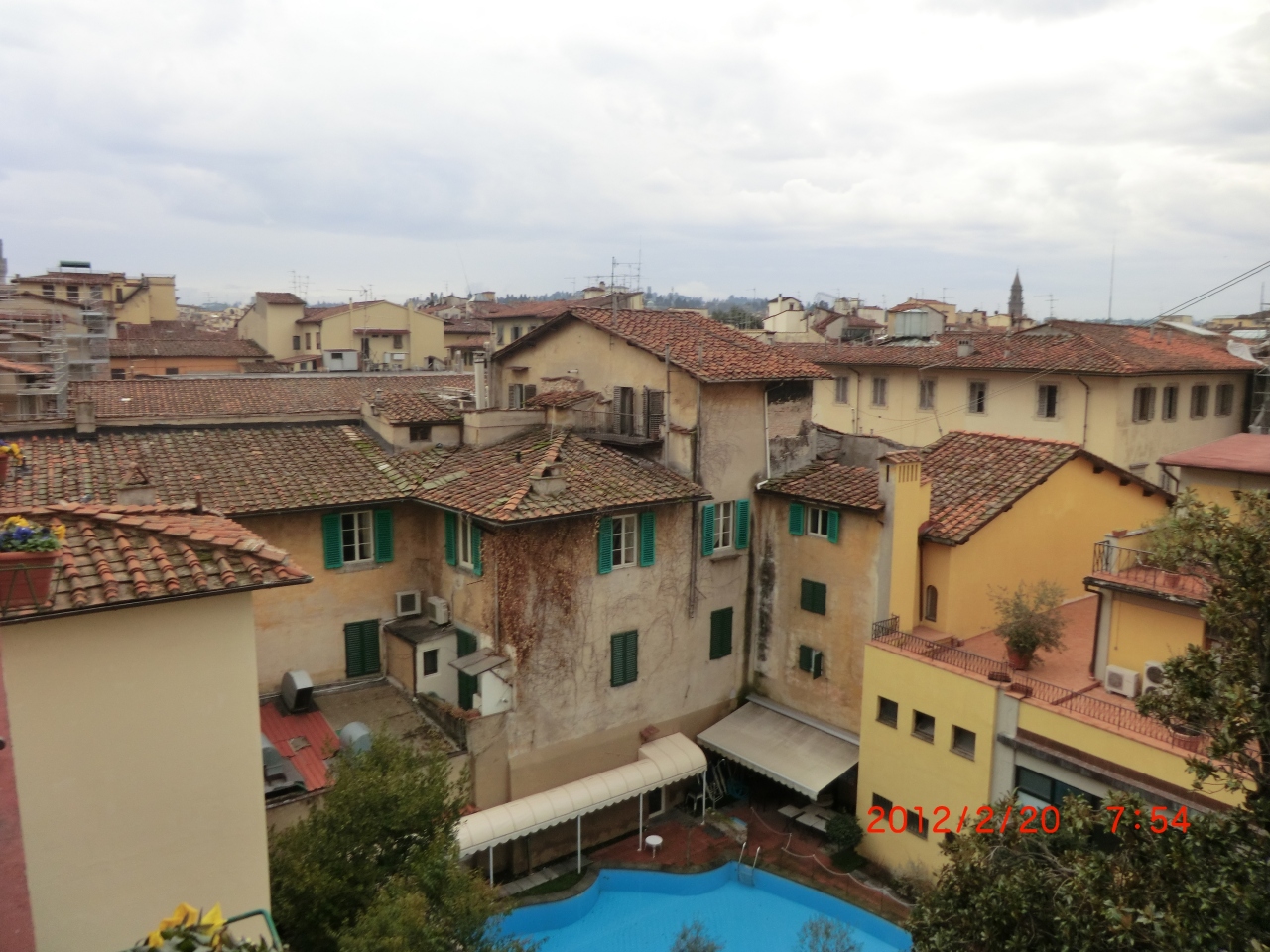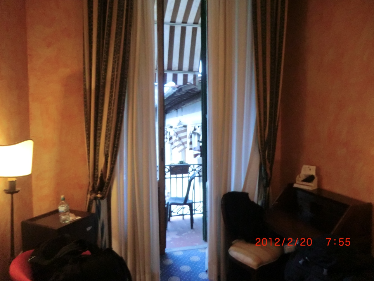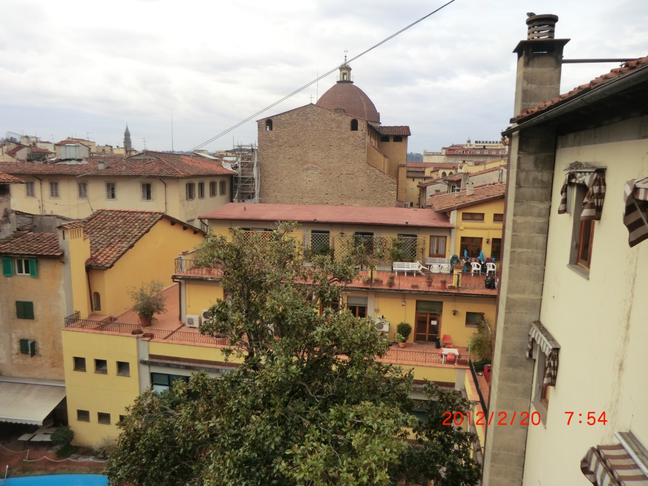 ウイーン、ミュンヘン経由寝台夜行列車で6:22到着 事前にホテルにはメールで荷物を預かってくれるか確認済み。このホテルを選択した理由は二つ。駅から近いこと。同行者会社福利厚生ポイントで無料で宿泊できること。駅からホテルまでは200-300m。立地はサンタ・マリア・ノヴェッラ薬局を道を隔てて反対側。サンタ・マリア・ノヴェッラ教会へは200-300m。7:00にホテル到着。バウチャーを見せて荷物を預かること交渉。7:50にチェックイン可能とのことで4Fの部屋に案内される。その間、日本人ツアー客20-30人がホテルの前のバスに乗車し、出発した。ホテルの部屋は4F。234度の方向に向き、左側ホテル客室、正面右側の他人の家で四方を囲まれた中庭に面している。正面に他の家の生活が良く見える。映画「裏窓」の世界である。ベランダに出ると、花鉢の土にタバコが残っており、前宿泊者が利用したものと推定される。禁煙ルームではあるが喫煙者もベランダで喫煙可能である。食事は可もなく不可もなく、皆朝が早いので9:00を過ぎると品数がすくなくなる。別に朝食付きを頼まず付近のカフェでゆっくり朝食を食べることを推奨する。朝食付きの宿泊設定があるのは、朝早く出発する日本人観光ツアー向けではないだろうか。