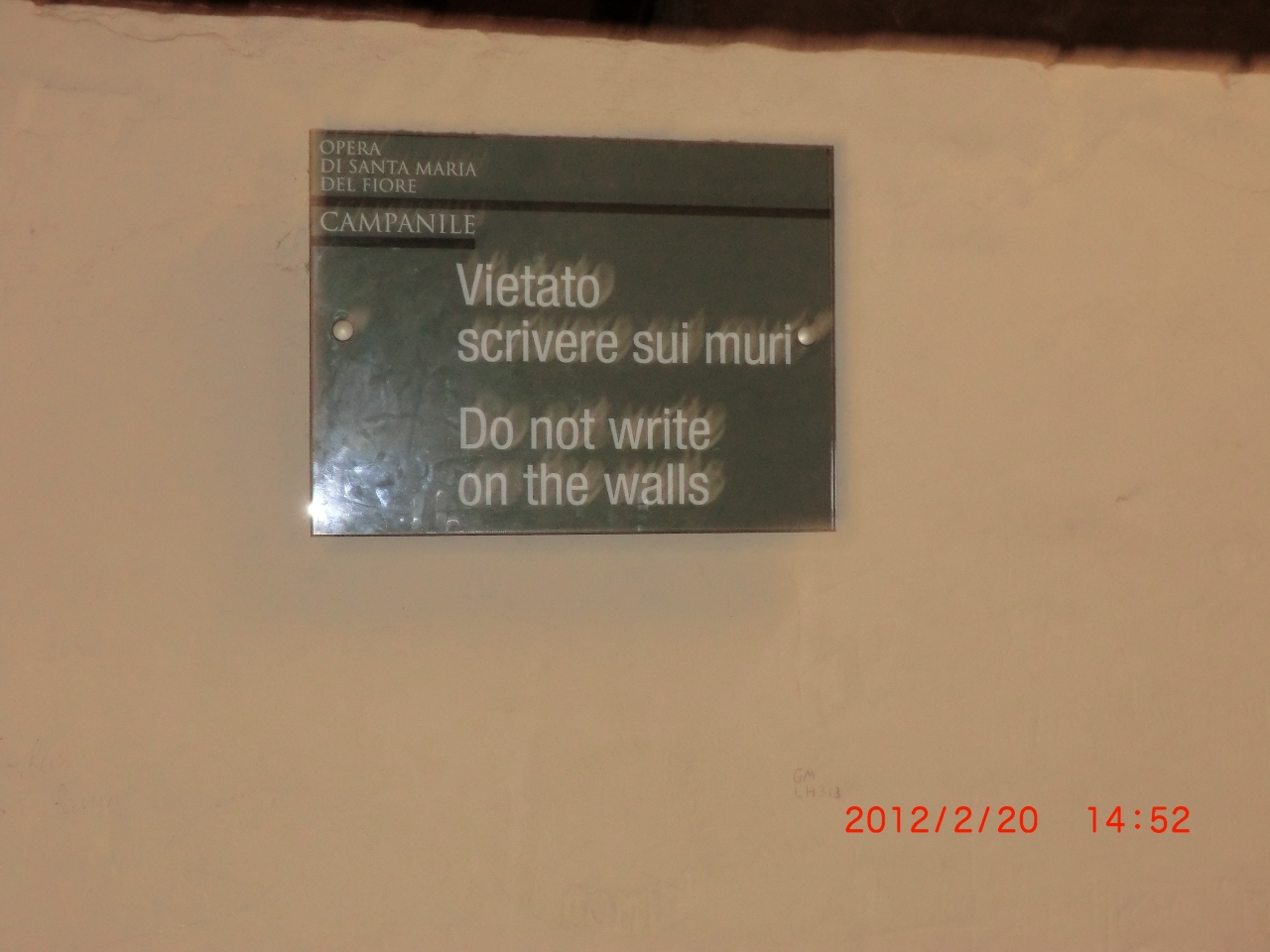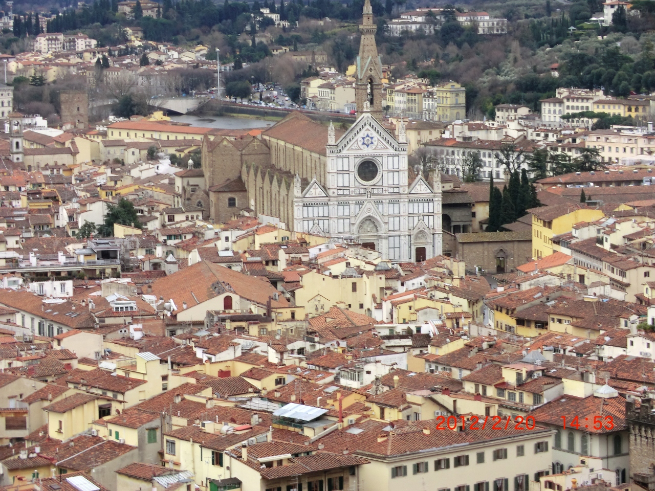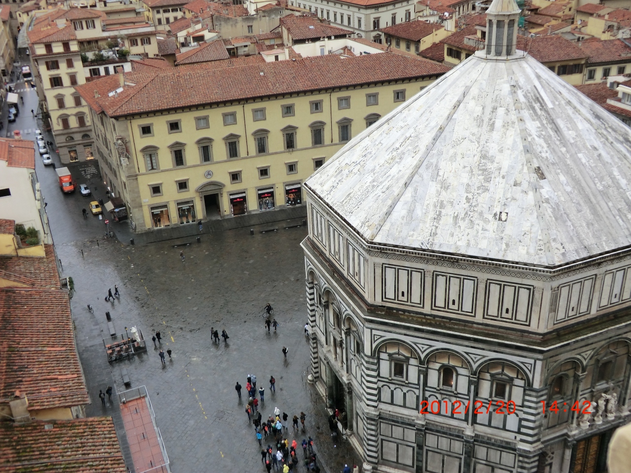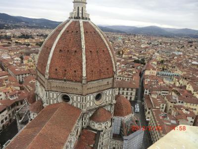14:27 待たずに登頂開始 14:58最上階へ 老人はゆっくり上った方が良い。途中に踊り場が複数あり、ここが最上階思うと隠れたところに次の階への狭い階段あり、まだ最上階でなかったかと度々がっくりする。階段は急で狭く手すりがなく、老人には無理。手には荷物を持たないほうが良い。ただ、最上階に上がるとフィレンツェの四方が見渡せる。この喜びは格別なものがある。足がガクガクするが一度は上ることを推奨する。