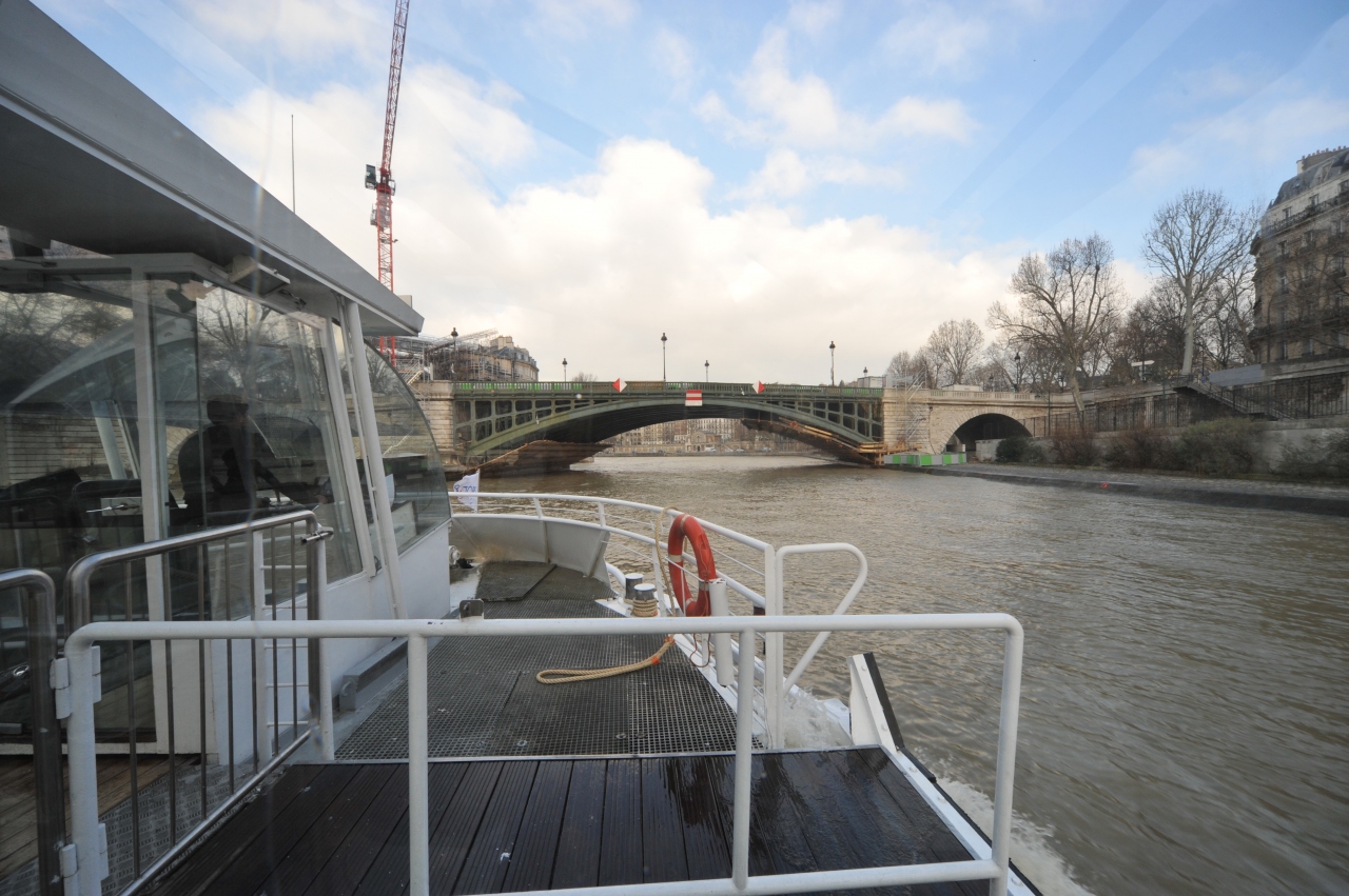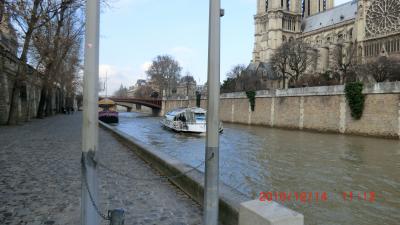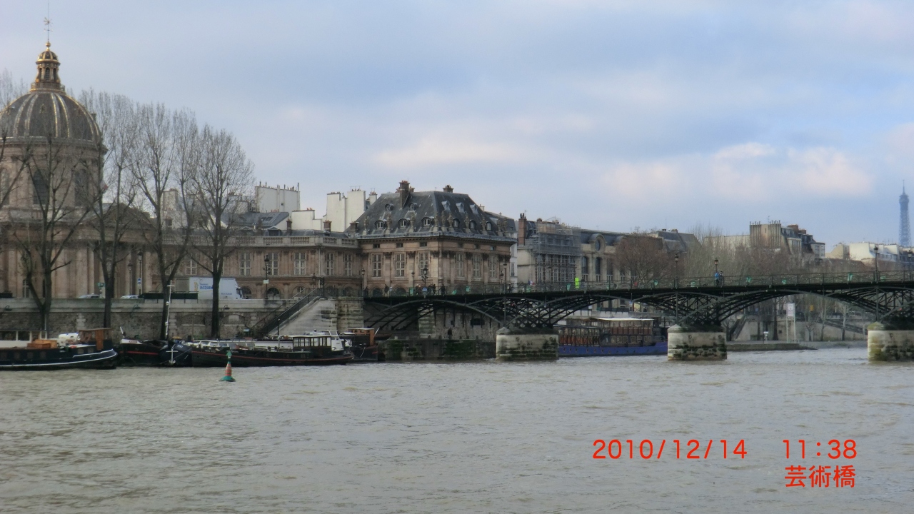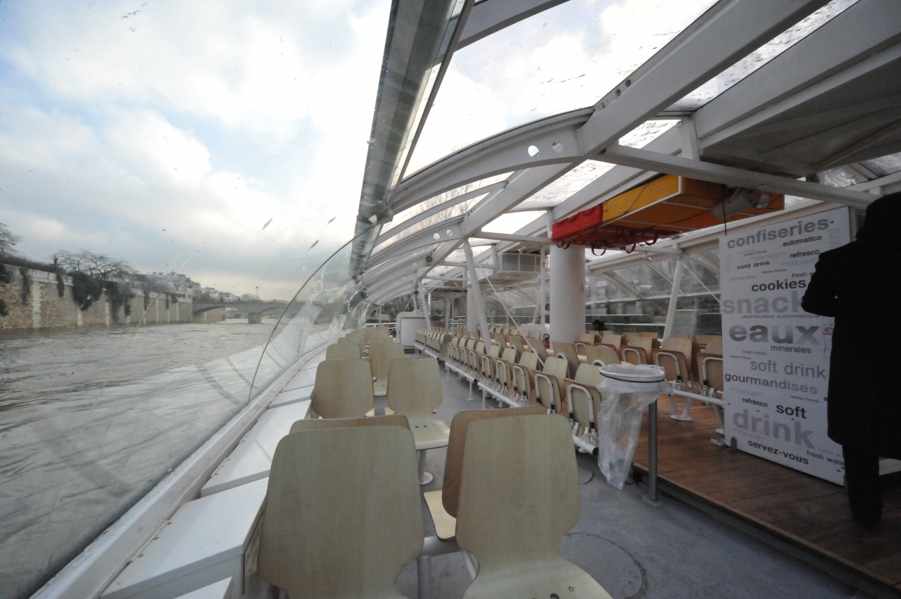 パリも三度目四度目となると一通りは見ており、変わった視点、位置からパリを見てみたいと思うようになる。行きたいところへ速やかに行くためにはパリは地下鉄が最適。行きたいところが特にないが時間があるのでゆっくりセーヌ川を回って見たい向きにはこれが最適である。パリへ行ったのは12月、ヨーロッパに寒波が襲来し、パリの最高気温が5-6度。天候は曇。ガラスの屋根が付いている船内でも寒く、後尾のデッキはなおさら寒かった。船内では、冷たい飲み物は販売。本当に欲しいのは熱いコーヒー。