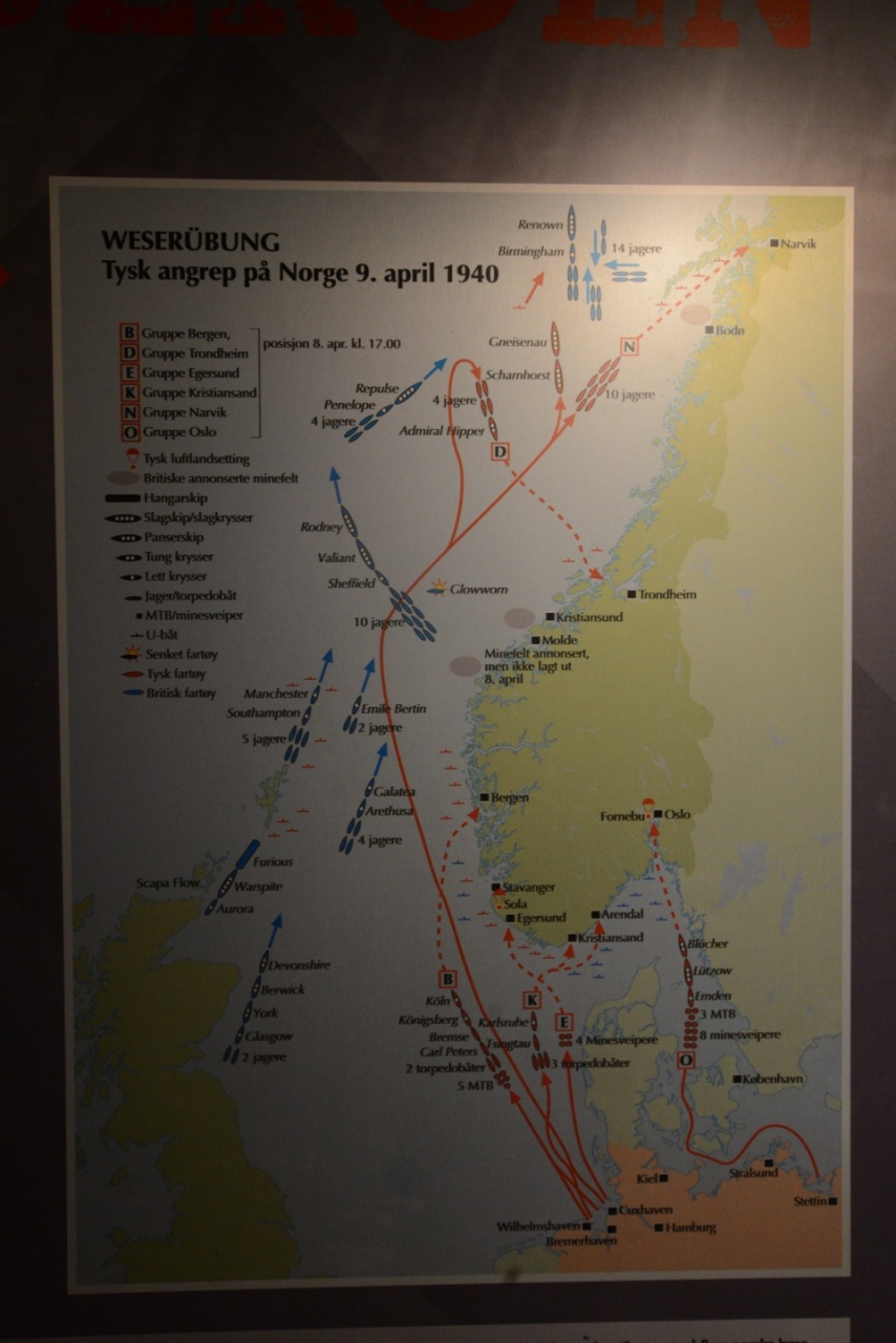 1940年4月9日オスロへの入口 ホルテン港ノルウェー海軍艦艇及びオスカースボルク砲台により、オスロ占領軍を乗せたドイツ重巡洋艦ブリュッヘル沈没、水雷艇アルバトロス難破、軽巡洋艦エムデン損傷させ、ドイツ軍によるオスロ占領を一日遅らせることとなった。この間、ノルウェー国王は陸路と海路により、イギリスに脱出し、亡命政府を樹立する。