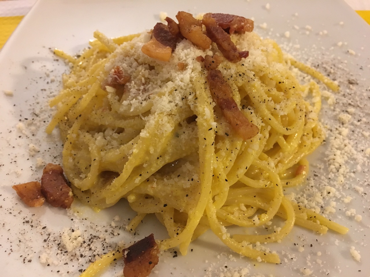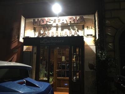 道に迷いながら、ようやくたどり着いたカルボナーラ。ヴェネチア広場から歩いて行きました。期待値が高かったせいか、日本のカルボナーラとは違っていて、少しボソボソとしていました。塩気が少し強い感じです。麺も太くて固めです。夜19じに行きましたが、開店後は、地元の人を含めすぐに満席でした。日本人は、私を含めて5組くらいでした。