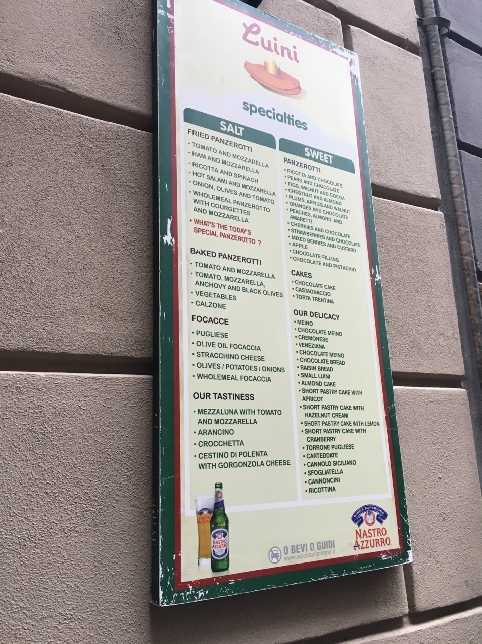 ガッレリアを出てすぐのところです。並びますが、進みは早いです。お昼時で、30分かからないくらいで購入出来ました。スィーツ系と惣菜系、他クロワッサンなどがあります。どちらも美味しいです。料金は、3ユーロ前後でお手頃です。
