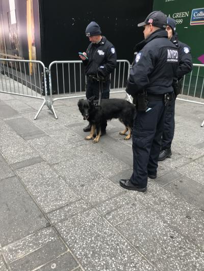 ボディチェックの警察官と警察犬です。食べ物もボディも金属探知機も使って...