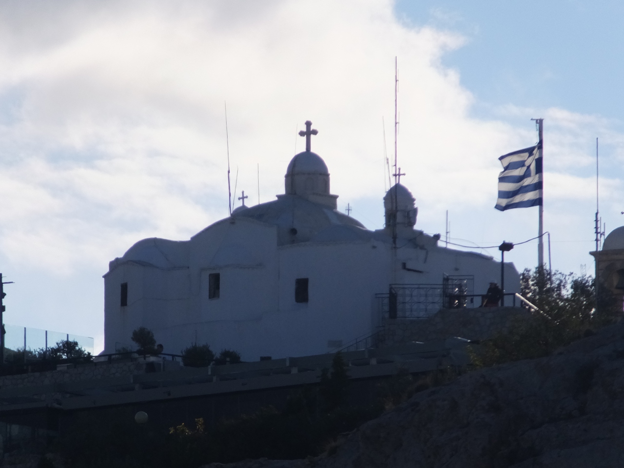 頂上には白亜の教会とギリシャ国旗。こちらも青空によく似合う…