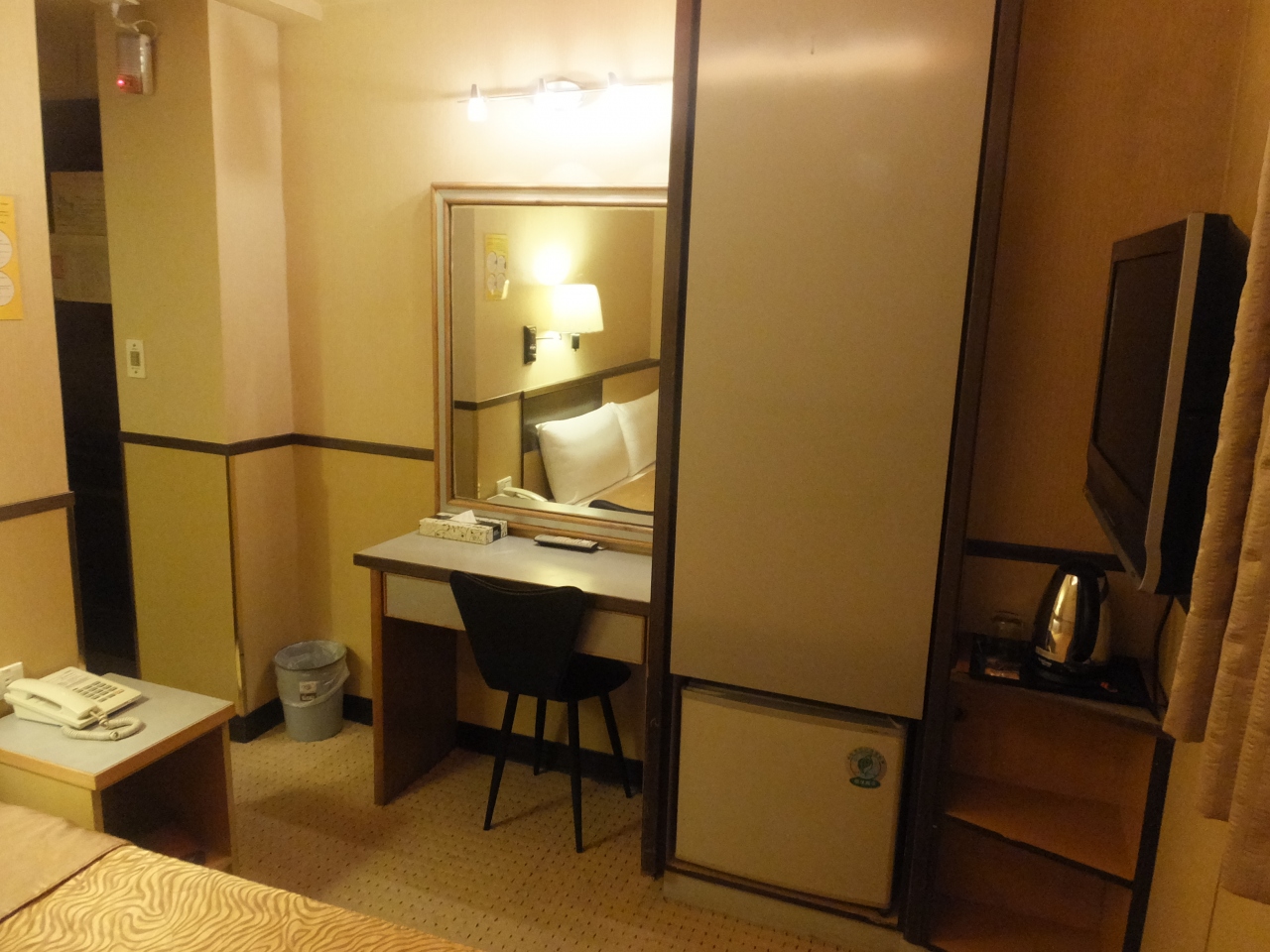 ダブルベッド・クローゼット・液晶テレビ・冷蔵庫・電気ポット・インスタントコーヒー・ティーパック・ライティングデスク・ベッドサイドテーブル・バスタブ・ハンドシャワー・ドライヤー・ボディーソープ・シャンプー・ティッシュ- 旅行時期