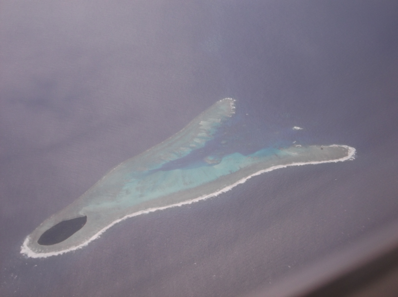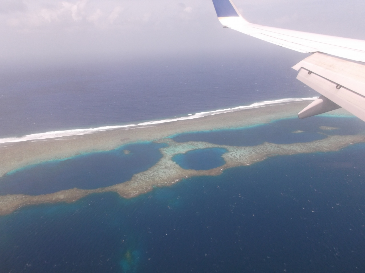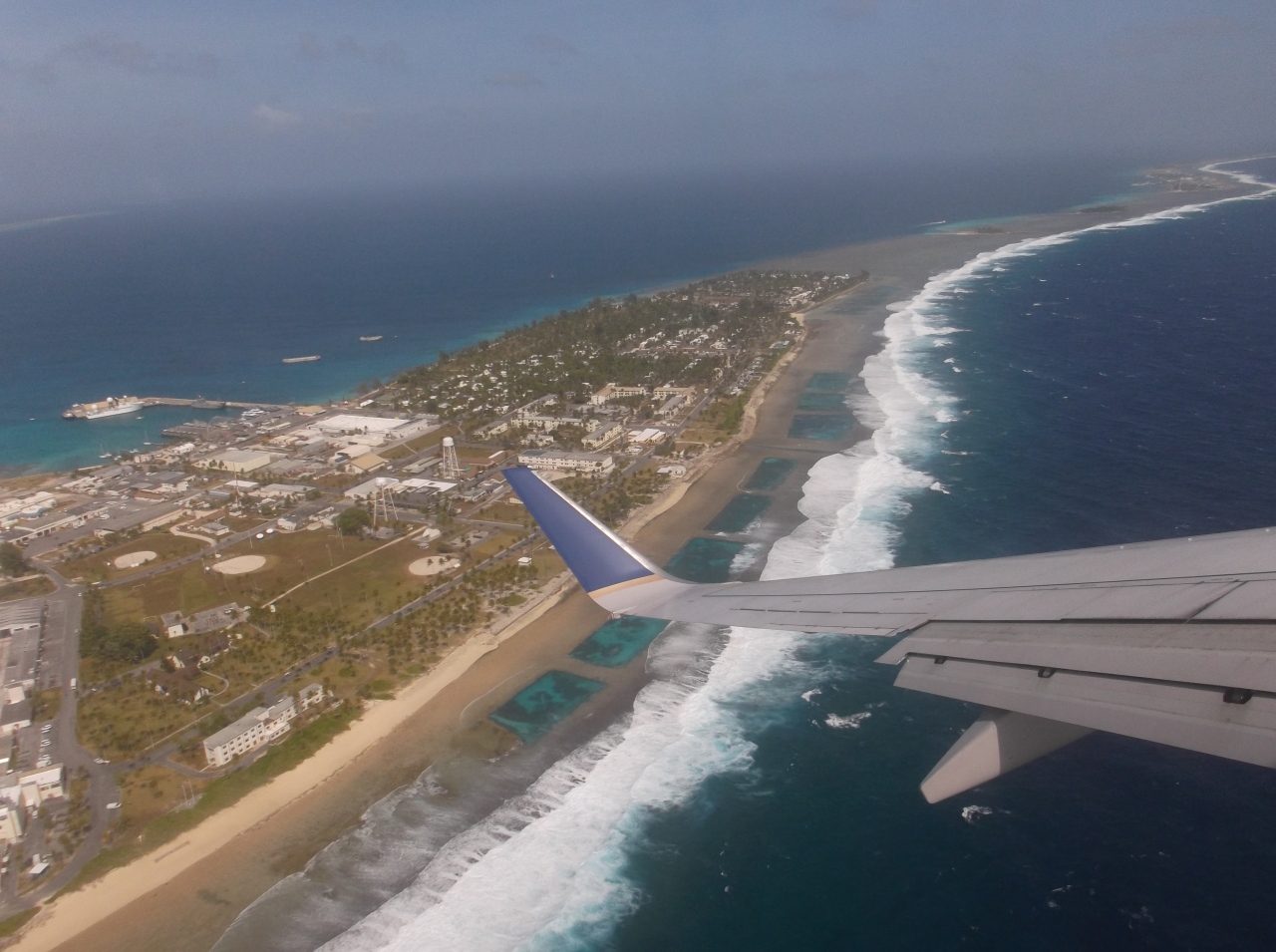 9:14にマジュロを出発した旧式の小型機は、2時間弱のフライトと中継地の空港で約45分の待機を繰り返し、15:32に最終目的地のグアムに到着。8時間18分ものロングフライトでした。それでもまずまずのお天気で、ミクロネシアの島々と海の絶景を心ゆくまで満喫できたので、退屈することは一切ありませんでした。