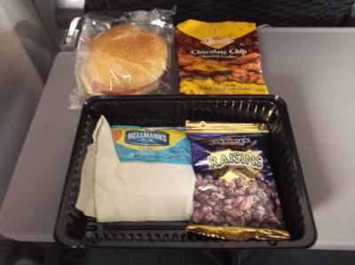 1回目の機内食は、チキン・豆腐(ベジタリアン)の2種類。私はベジタリアンにしました。ちょっと不思議な味でしたが美味しくいただきました。