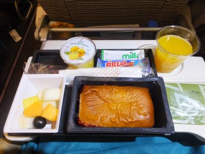 到着の1時間30分前に2回目の機内食。和食(おかゆ)・洋食(ベジタリアン)の2種類。またしてもベジタリアンをチョイス。カスタードカルゾンというスイーツだったのですが、付け合わせのミックスベリーコンポートとの相性が良く、酸味が効いていて美味でした。