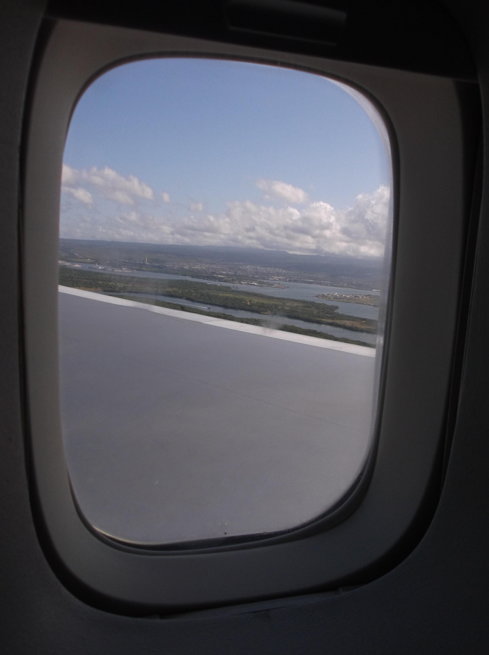 事前に追加料金(\2,900)を払って、足元の広いExit Row Window Seat(35A)にしました。おかげで、ほぼ満席にもかかわらず約7時間のフライトもラクチンでした。