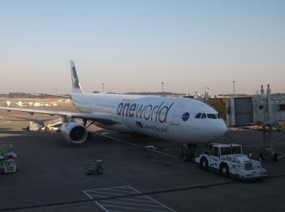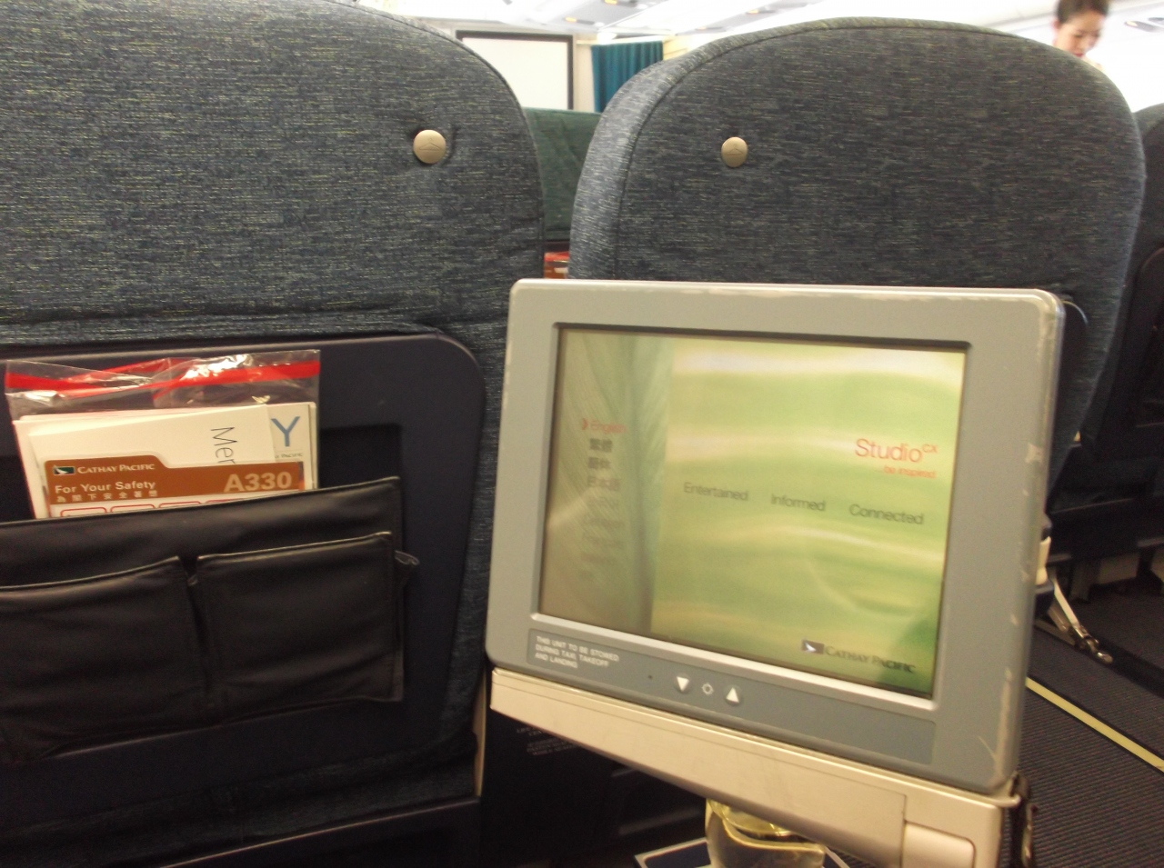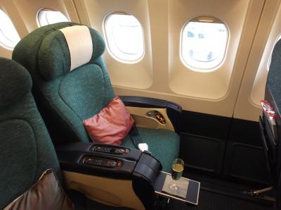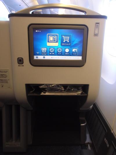 機材はエアバスA330。フルフラットではなくリクライニング式。それでも座り心地はかなり良い。ビデオモニターも充分な大きさ。