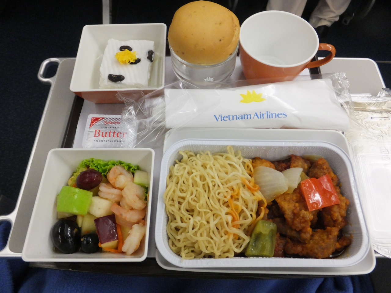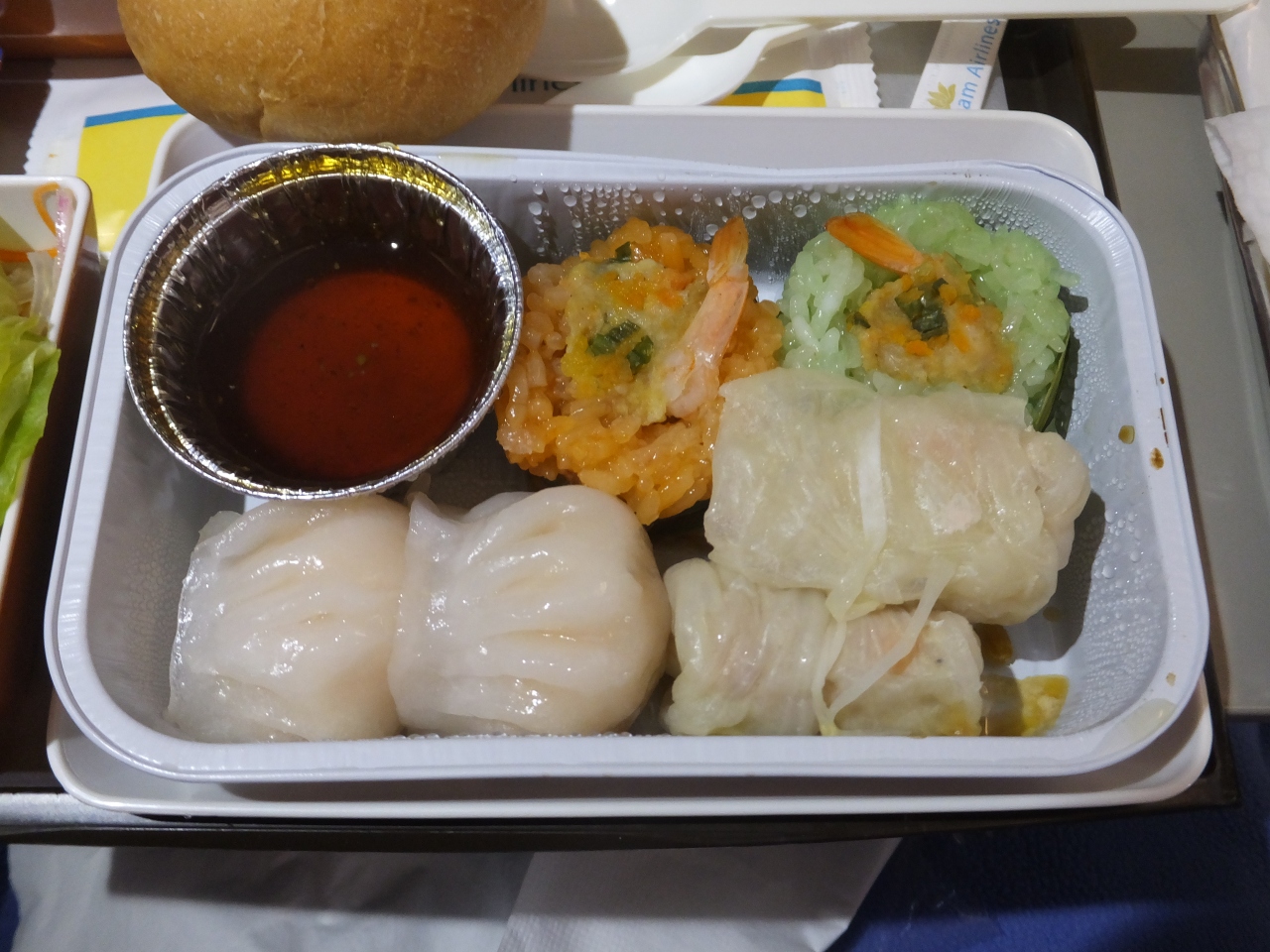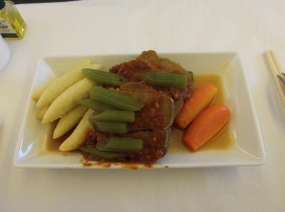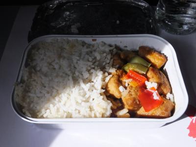 事前予約しておいた機内食(Beancurd Kung Pao)は、出発の2時間後にサービスされました。ベジタリアンミールだったのですが、なかなか美味。