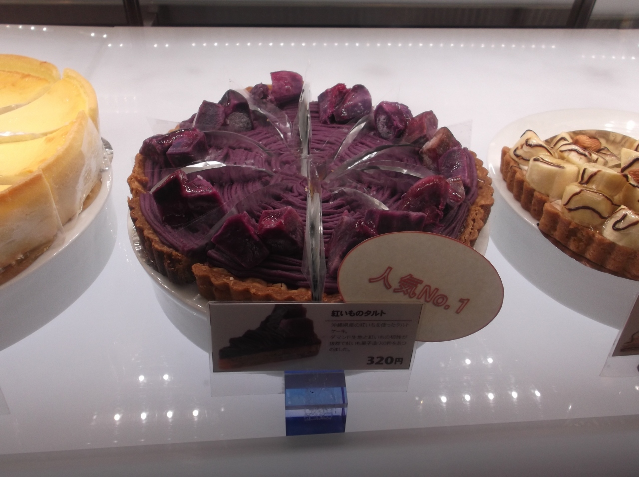 人生初の沖縄旅行に来ていた私は、沖縄土産をたんまりと買うべく、国際通りにあるお菓子御殿に来ていました。欲しいものをひととおり買い、ホッとしたところにふと目に入ったのが、同じフロアにあった小さなカフェ。ショーケースを覗いてみると、なんとも美味しそうな紅芋タルトがあるじゃありませんか(しかもデカい!)。でも、その日は既に夕食も済ませていてお腹いっぱい。翌日のお楽しみとしました。