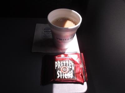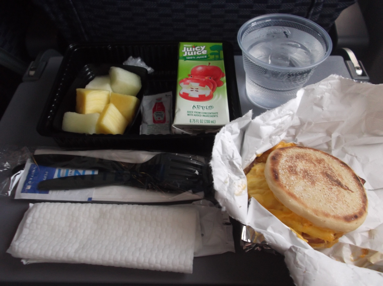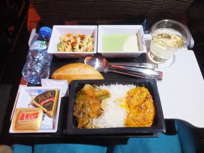 最初の機内食は、ビーフ・チキン・ベジタリアンの3種類。私はベジタリアンをチョイス。まずまずの味でした。