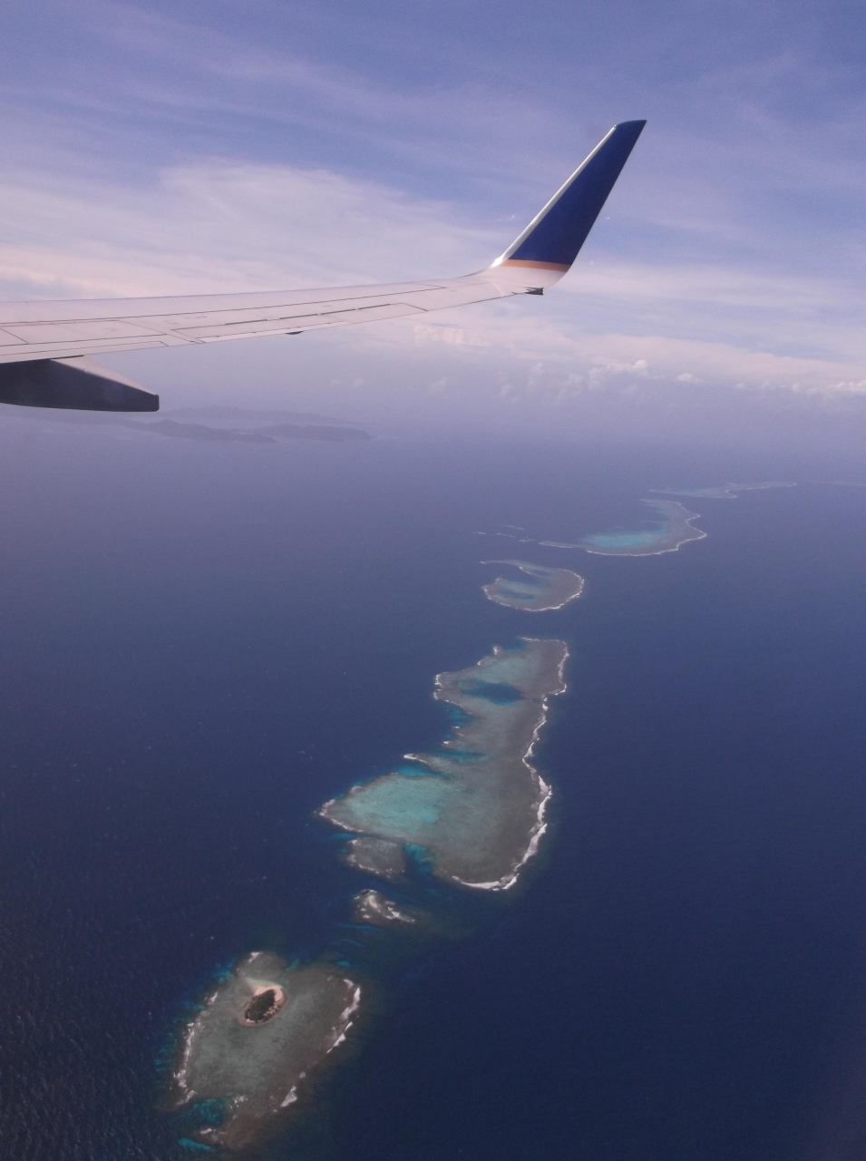 このフライトの魅力は、何と言ってもミクロネシアの島々と海の絶景!