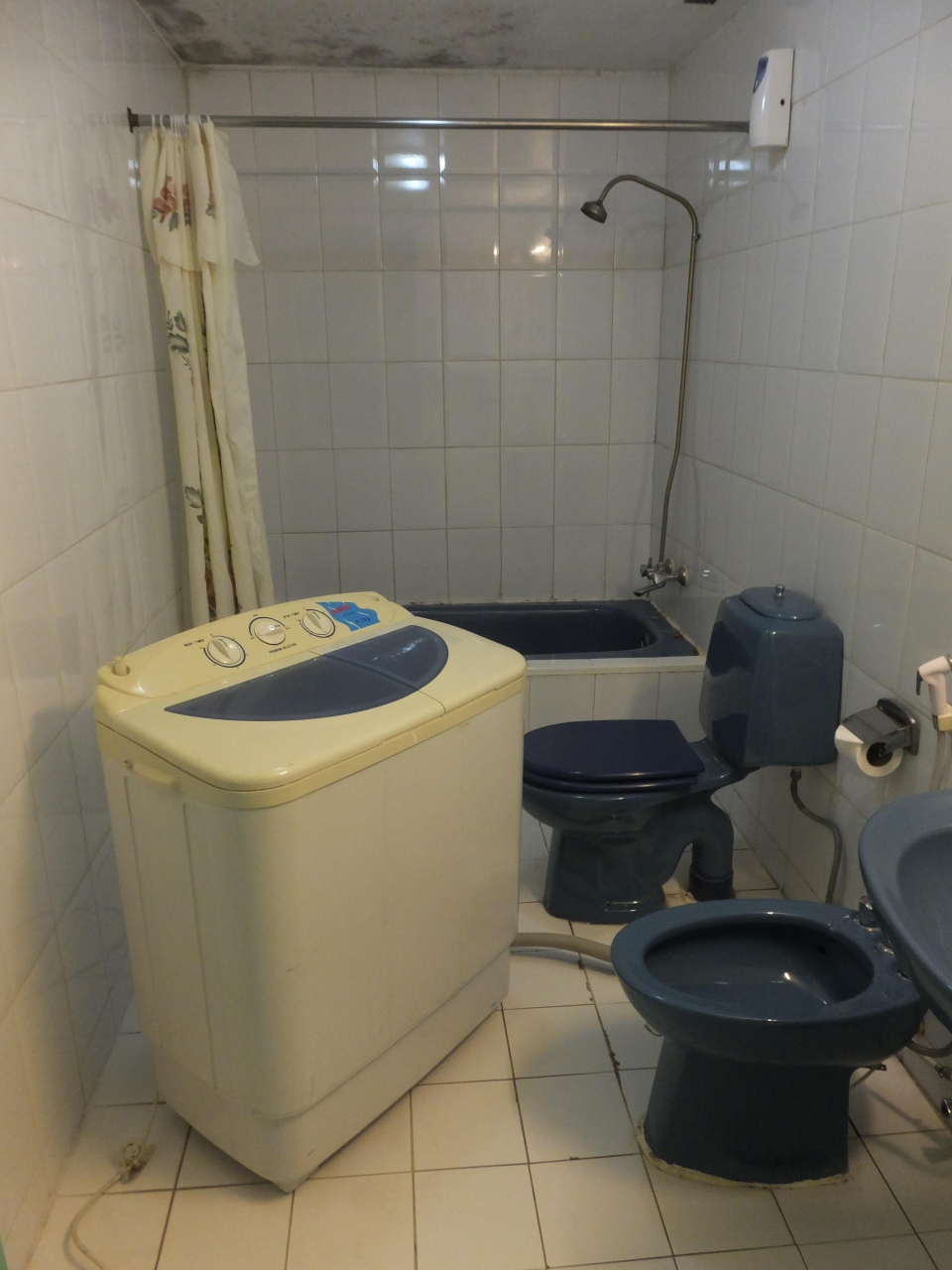 お次はバスルーム。ドアを開けると目に飛びこんできたのは、なんと!今や懐かしい二槽式洗濯機(ちなみに三洋電機製でした)。