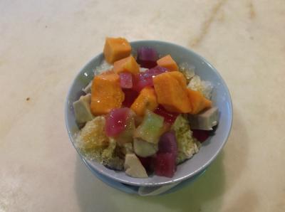 食後のデザートはボボチャチャ。色とりどりのお芋のデザートで、見た目が美しいだけでなく低カロリーで健康的。もちろん味も◎。お腹が膨れました。