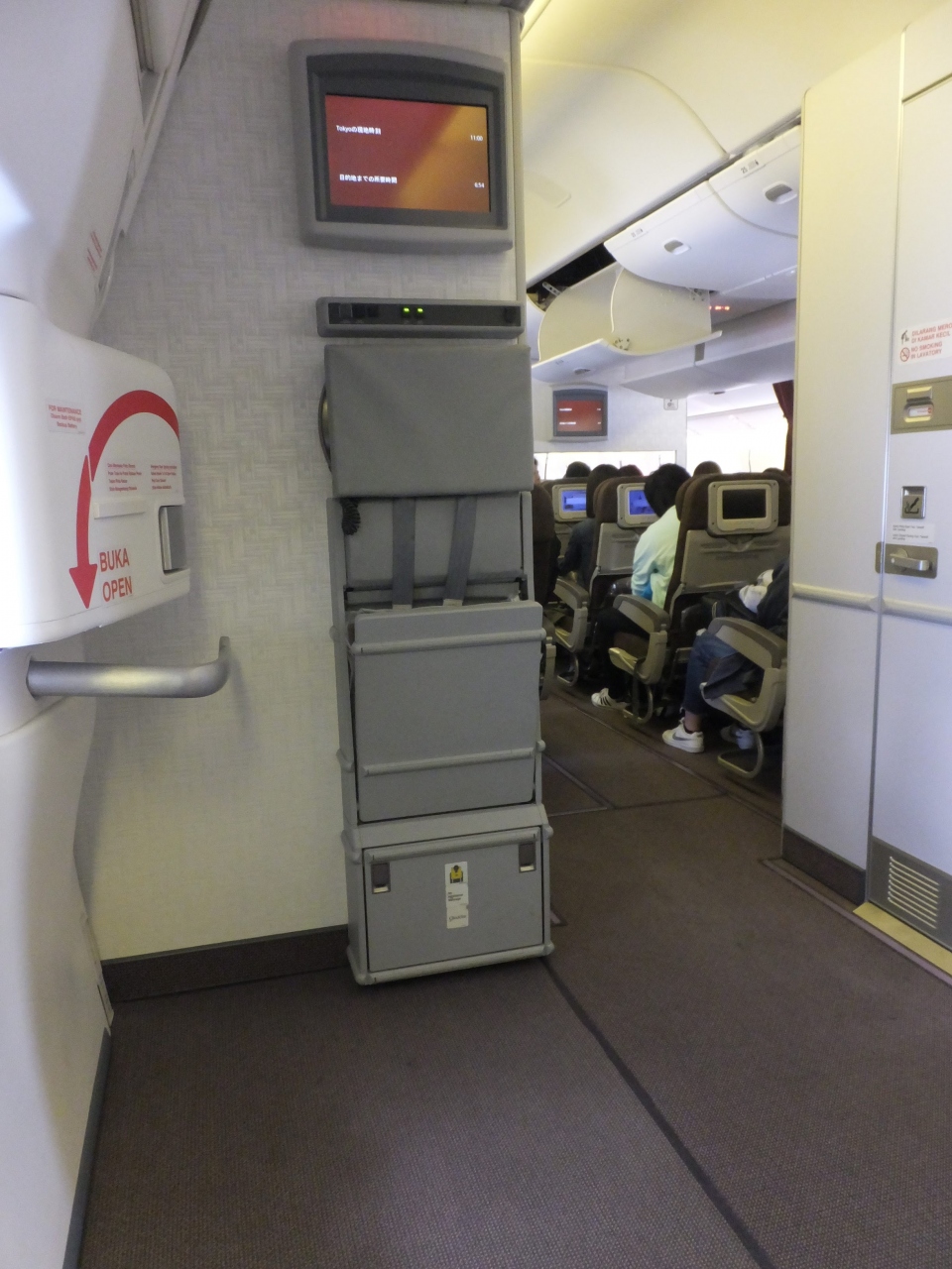 機材はB777-200。座席配置3:4:2の変則型。これはカップルとか夫婦+子供2人とか様々な乗客に対応できるように配慮したらしい。なるほど。