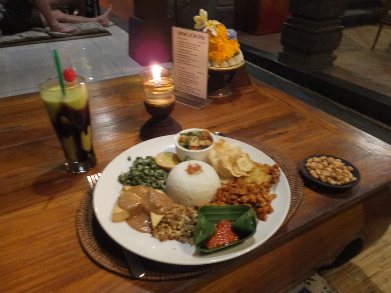 滞在先(ウブドレスタリバンガロー)から至近距離だったのと、夜遅くまでオープンしていたので、到着日のディナーをここでいただきました。