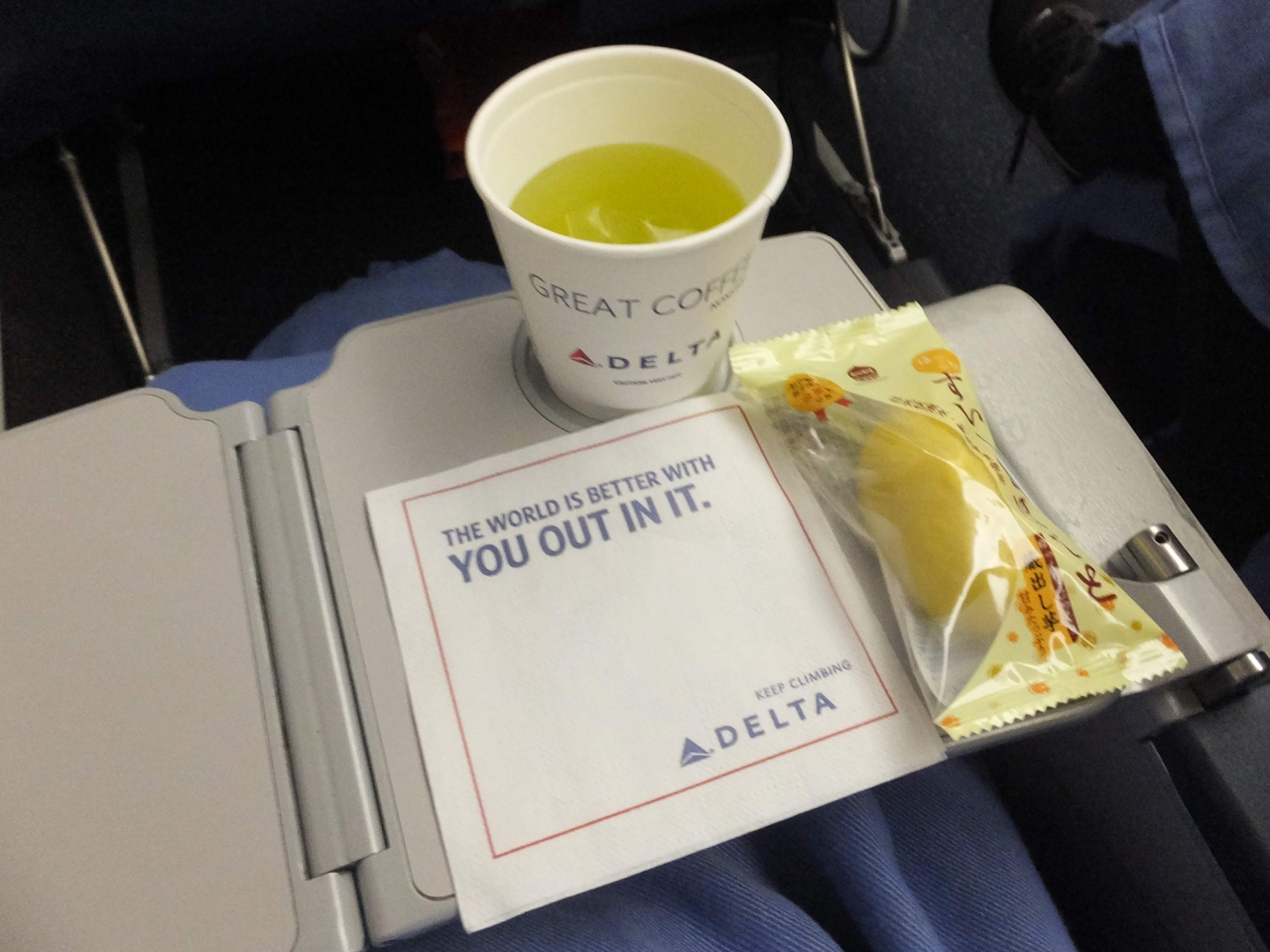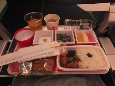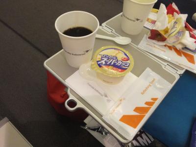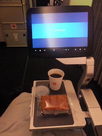 到着前の軽食(スポンジケーキ?)も一緒に持ってきてくれた。なんとお味噌汁まで。JAL、なかなかやるなあ。
