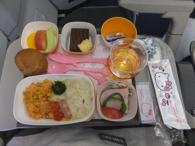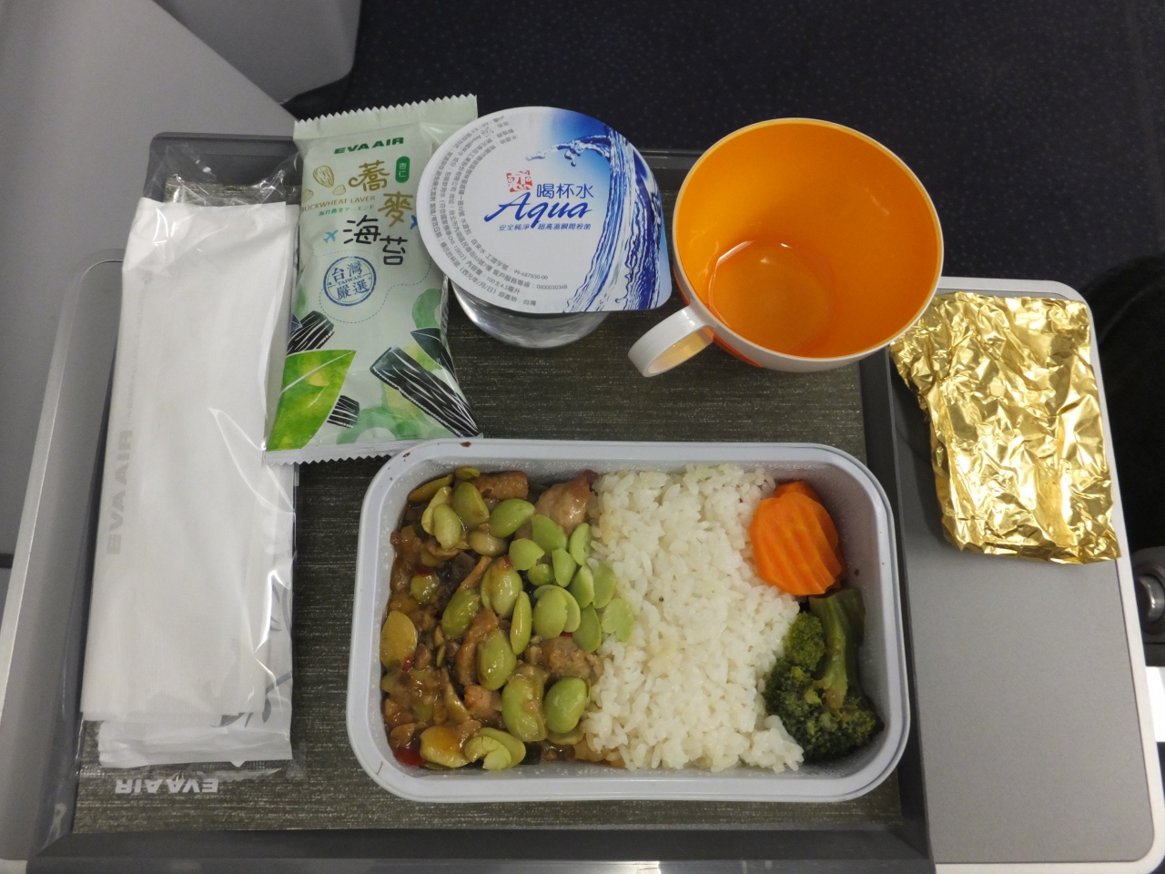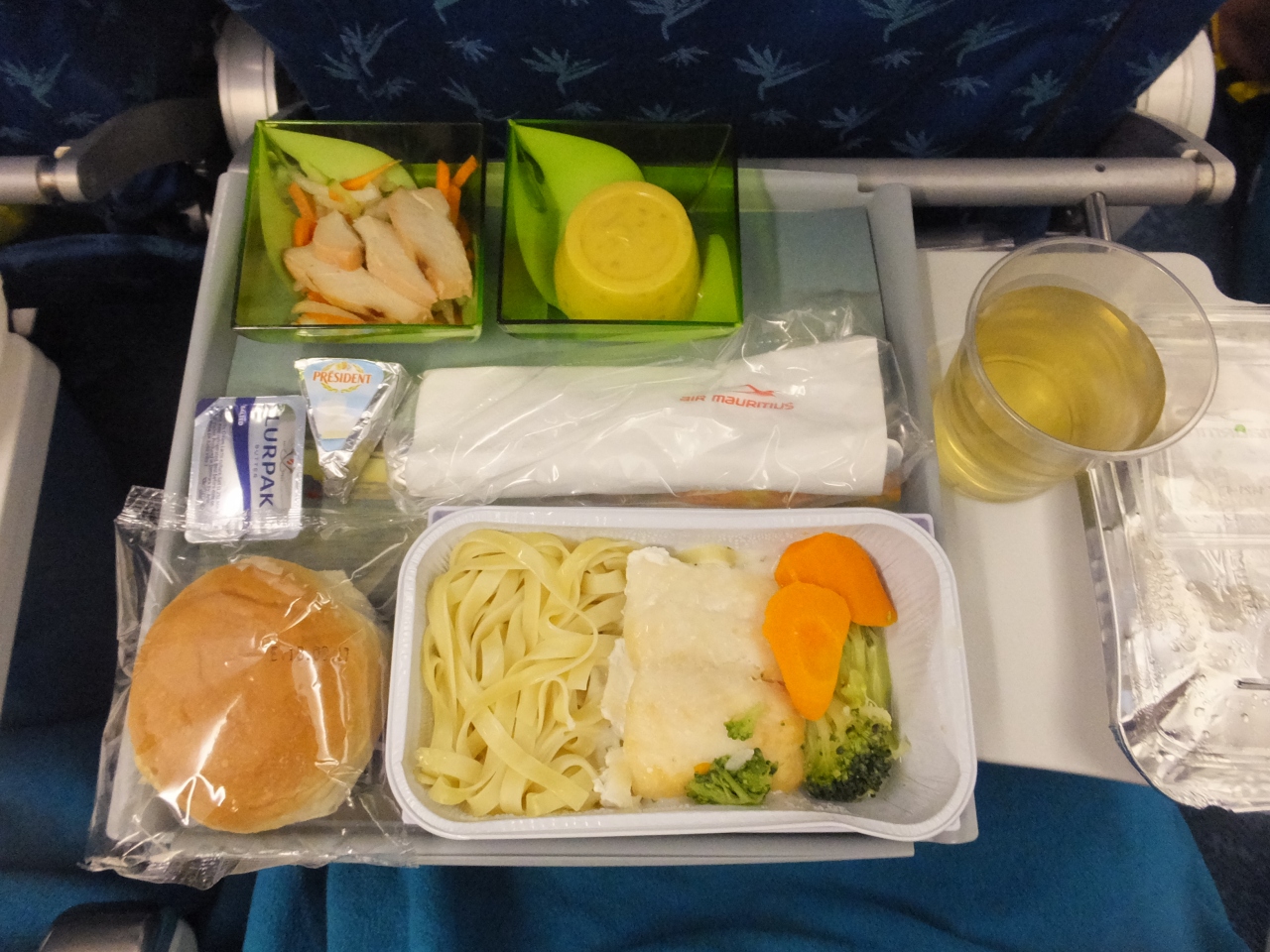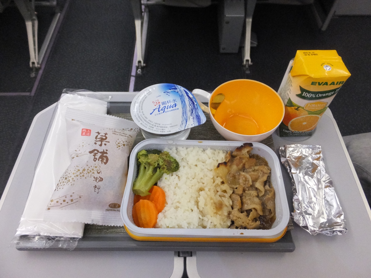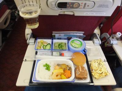 機内食はビーフとご飯またはポークとビーフン。私は後者をチョイス。白ワインと一緒にいただく。