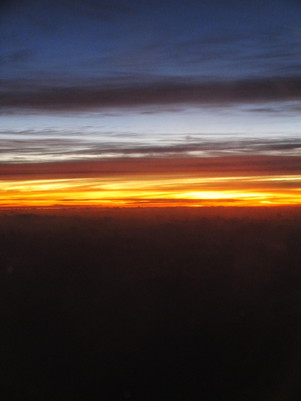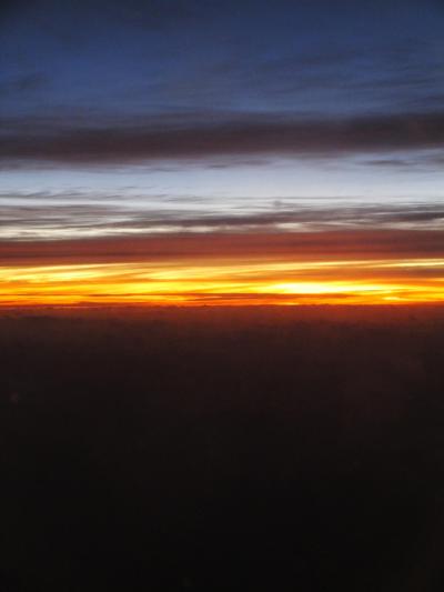 飛行機が降下を始めたので窓の日除けを上げたら、美しい夕焼け!