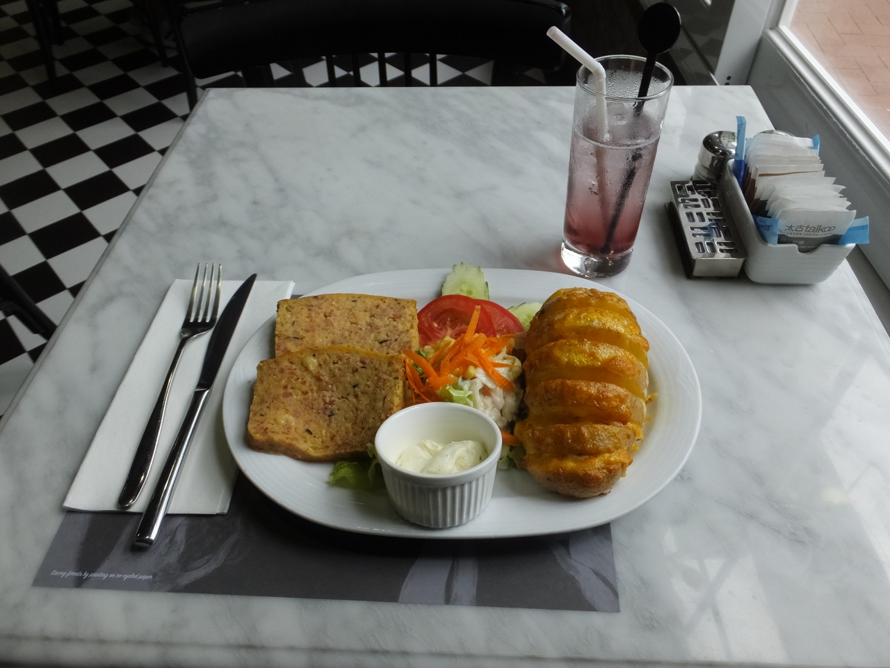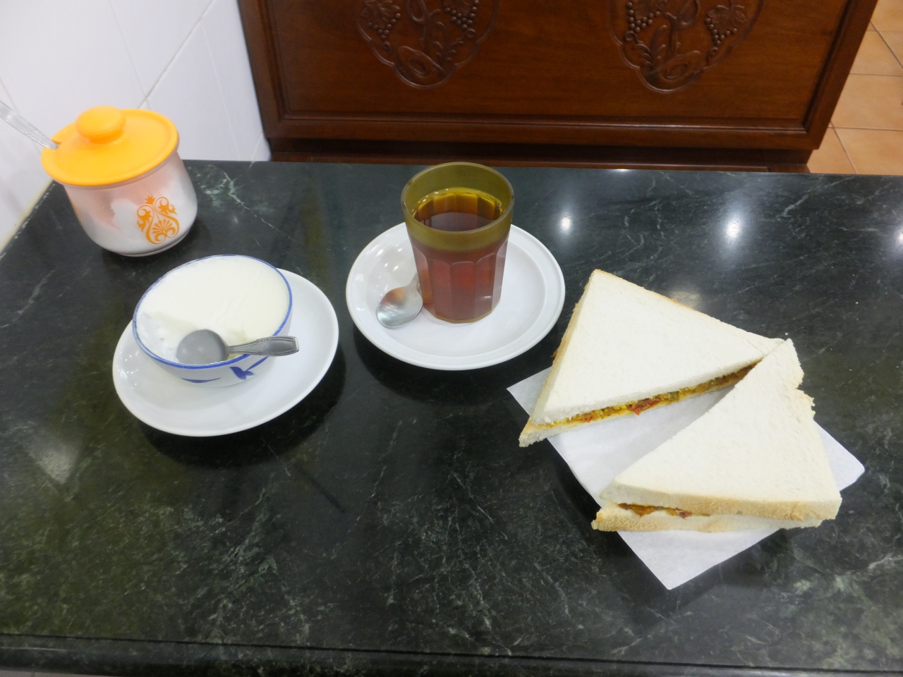 - ハム&チーズサンドイッチ:25+冷たい小豆ミルクプリン:35+ホットミルクティー:20=80パタカ(約\1200)…観光客価格だわ(涙)
