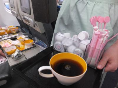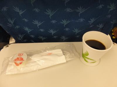 海外発の便の和食は微妙なことが多いんだけれど、もう洋食にはウンザリしていたので当然和食。で、肉より魚党の私は当然魚。白ワインとともにいただく。