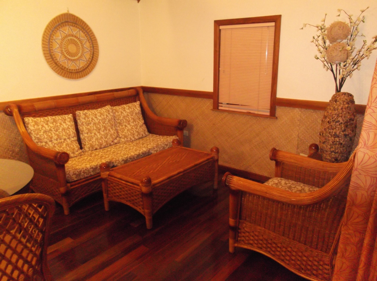 ベッドやテーブル、椅子、ソファー等、籐製品で統一された部屋は温かみが感じられました。