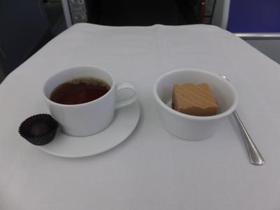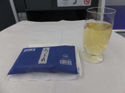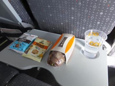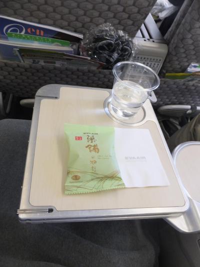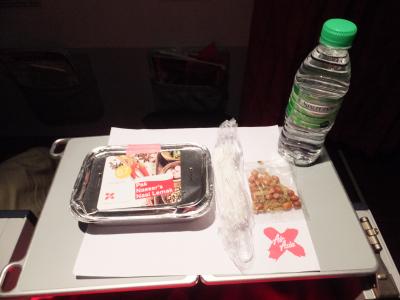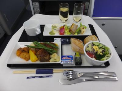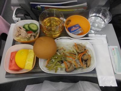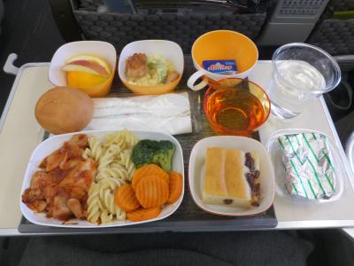 機内食はビーフ+ご飯またはチキン+パスタ。私はチキンを選択。