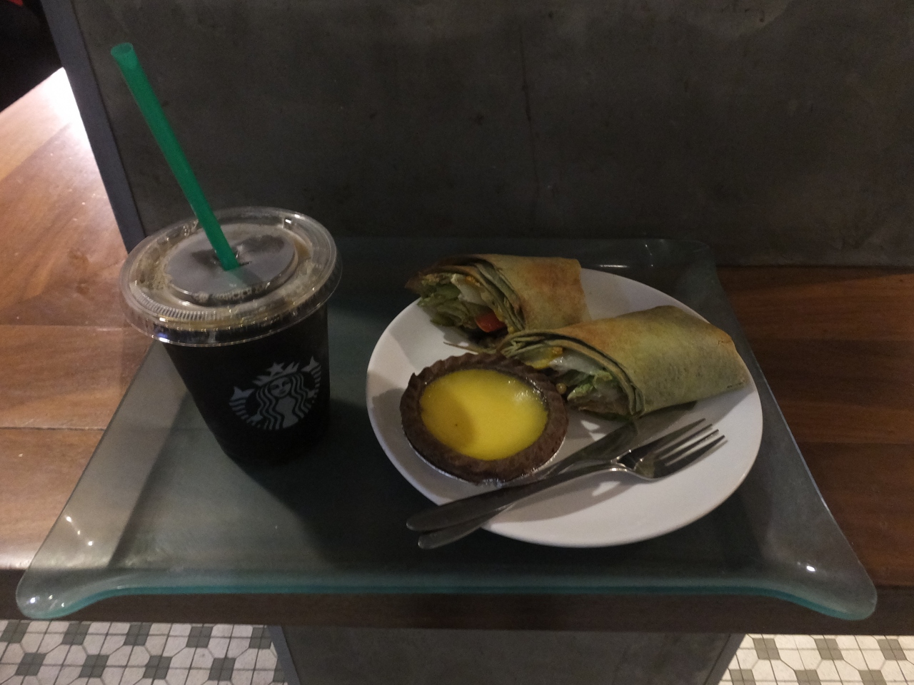 - ローストベジタブルラップ:$40=約\600 コーヒーエッグタルト:$13=約\195 アイスコーヒー(トール):$25=約\375