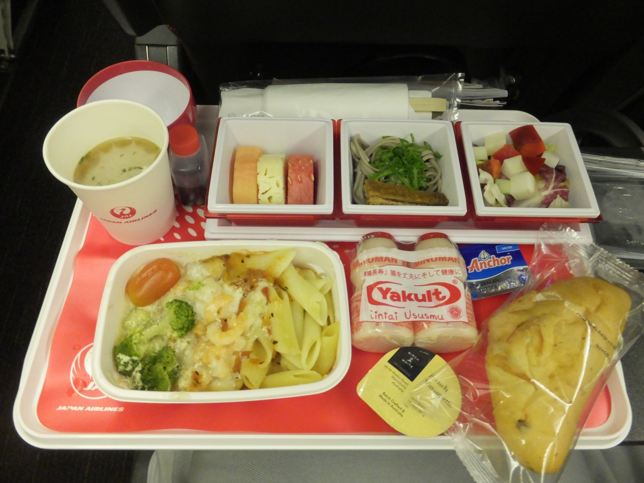 到着の約3時間前に機内食のサービス。私は洋食(シーフードとペンネ)を選択。