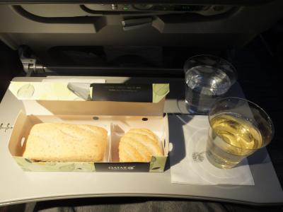 到着の1時間45分前に2回目の機内食。サンドイッチ(チキンまたはベジタリアン)とアップルパイを白ワインとともにいただきました。ベジタリアンサンドイッチはカレー味でなかなかグッド。