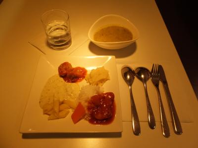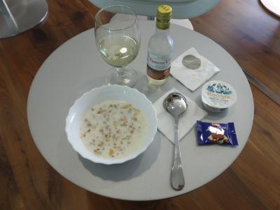 離陸の1時間後に機内食のサービス。メインはチキン+ライスまたはビーフ+ポテト。私はチキンを選択。白ワインとともにいただきました。