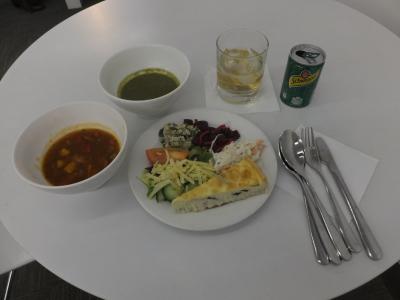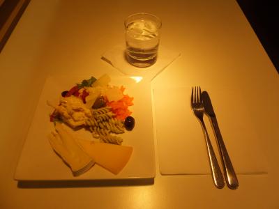 機内食は往路と全く同じメニュー。またしてもパスタサラダを選択。20分の早着。