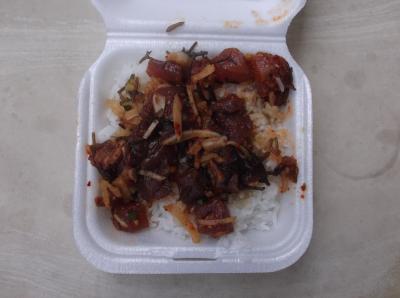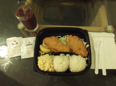 前回(2011年9月)はカイムキ店でサイミンをいただいたので、今回はカパフル店でマヒマヒのフライにしました。本当は店内で食べたかったのですが、空模様が怪しくなってきたのでテイクアウトすることに。