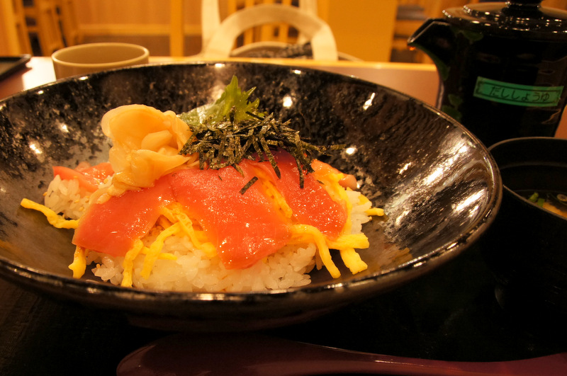 マグロは70gと書かれていただけあって赤身3切れ、中トロ4切れ。初体験のだし醤油をかけていただきました。- 旅行時期