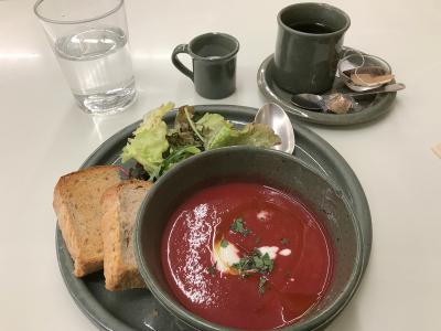 この日はビーツ。どろっと濃いスープは薄味で、サワークリームが良いアクセントです。濃い味に慣れていると物足りないかもしれません。サラダは葉物のみでドレッシングはビネガーオイル。カンパーニュは焼きすぎなくらいよく焼かれています。