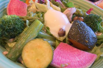 メインは和定食やダシ茶漬けですが、旅行前にがっつり野菜を食べたくてサラダとパン、カボチャのスープのセット。