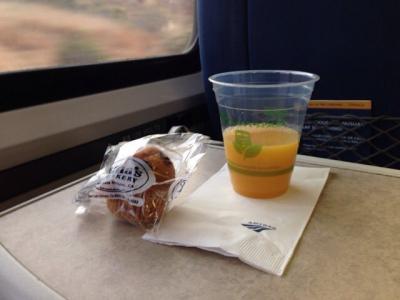 座席の種類はコーチクラス(=自由席)と、ビジネスクラス(=グリーン車)があり、ビジネスクラスを予約しました。コーチクラスにはそれなりに人が乗っていたので、ゆっくりしたい場合はビジネスがおすすめ。座席などはおそらく同じものですが、朝はマフィンや飲み物が食べ(飲み)放題、昼や夜はまた違ったサービスがあるようです。