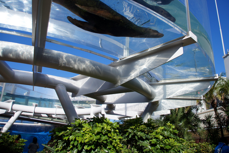 一方の屋外スペースには立地が十分に生かされています。アシカが空を泳いでいるように見えるドーナツ型水槽の『サンシャインアクアリング』。