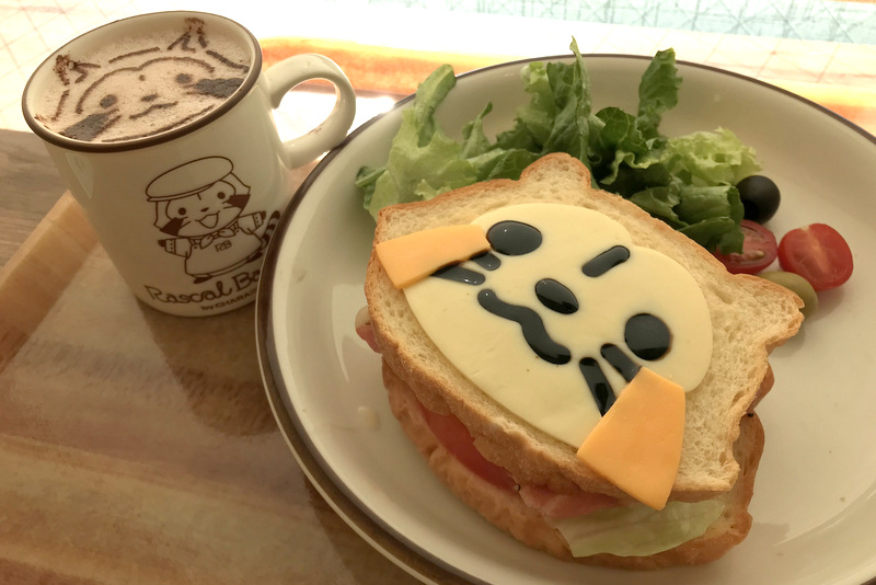 サンドイッチはスライスチーズとバルサミコソースでラスカルの顔が再現されています。具はベーコン、レタス、トマト、目玉焼き。別添えでサラダとオリーブもありました。