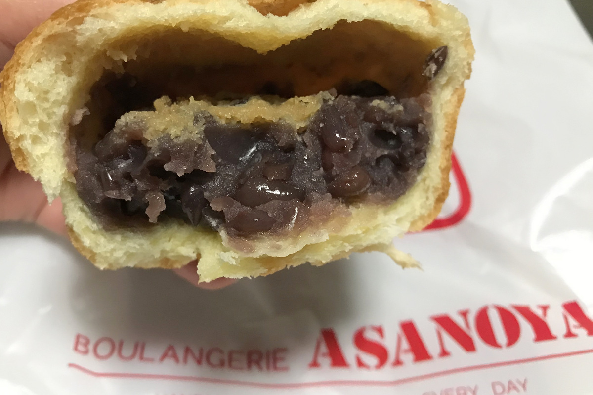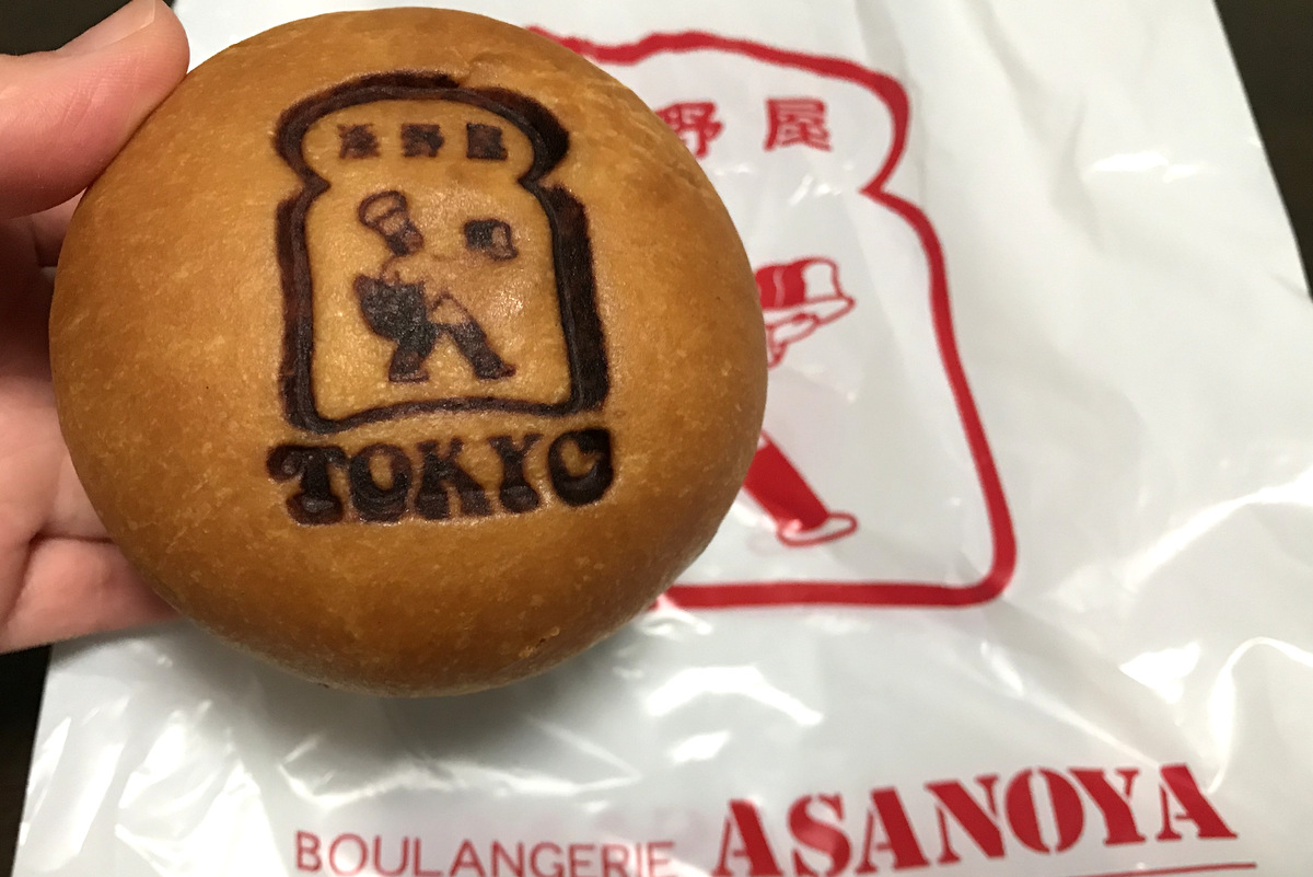 購入したのは焼き印入りの『黒糖あんぱん』。焼き印は東京駅と同じ、浅野屋のロゴとTOKYOの文字でした。中身は粒がしっかり残った粒あんと、その上に黒糖とアーモンドのクリームが乗っています。