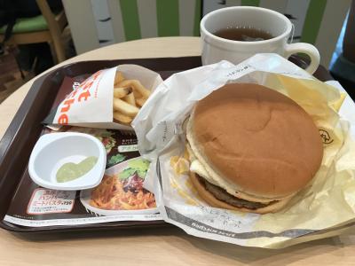 日替わりハンバーガー、ポテト(S)、ドリンクがセットになった得セットを注文しました。日曜日のこの日はチーズベーコンエッグバーガー。ドリンクはホットの紅茶にしました。
