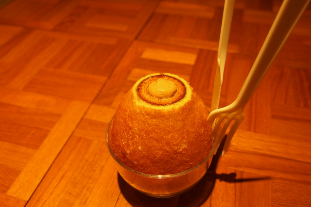 こちらの売りは、タマゴの形をしたエッグバウム。中心の穴の部分にクリームが詰められていて、カスタードとキャラメルの2種類がありました。他にも普通のバウムクーヘンや、食べ歩き用に一口サイズにカットされたものが売られています。
