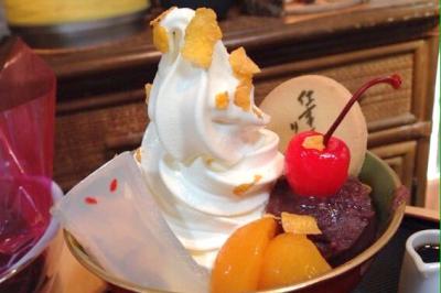 サンデーは一反もめんを模した寒天、鳥取の大山牛乳を使った濃厚なソフトクリーム、あんず、サクランボ、あんこ、クッキー、コーンフレークが入っていて、黒蜜か抹茶のソースが選べます。